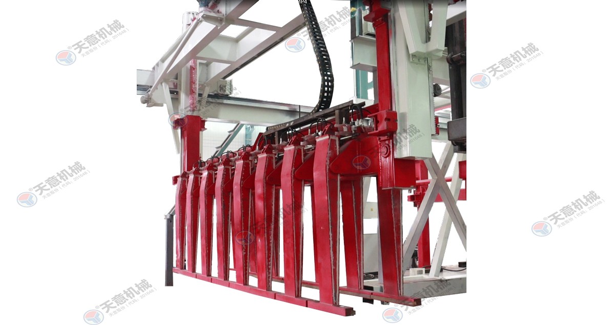 成品分垛吊機(jī):將蒸養(yǎng)車上的一模坯體吊運(yùn)至掰板輸送機(jī)上,然后將空側(cè)板吊運(yùn)至蒸養(yǎng)車上;切割工段空翻脫模機(jī)將模框翻轉(zhuǎn)90°,放在切割小車支座上進(jìn)行脫模,脫模后的??蚺c清理后的側(cè)模板進(jìn)行合模,合膜后的空??虮坏?..