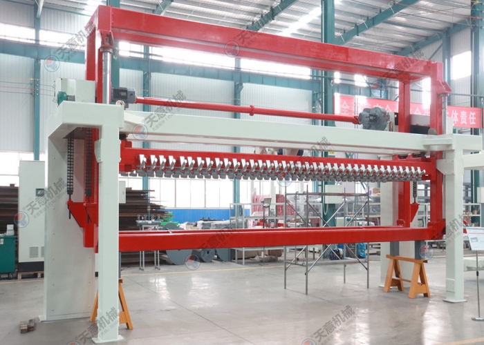 脫模后的坯體連同側板一起放置在切割小車上,切割小車由減速電機驅動行走,通過縱向切割機完成縱向切割,切割小車繼續(xù)行走至橫向 切割機中間位置停止后,由小車置換裝置將側板連同坯體抬起,切割小車退回翻轉行車底下進行下一次承載脫模后的坯體,另外一部切割小車 進入置換裝置底下后, 置換裝置將側板連同坯體放置該切割小車上后,橫向切割動作后啟動進行橫向切割動作,切割完成后,切割小車再行走至確地行車底下,再由 翻轉去底行車將坯體去底(連側板)吊至蒸養(yǎng)小車上,切割小車范圍原始位置進行下一個切割循環(huán)。